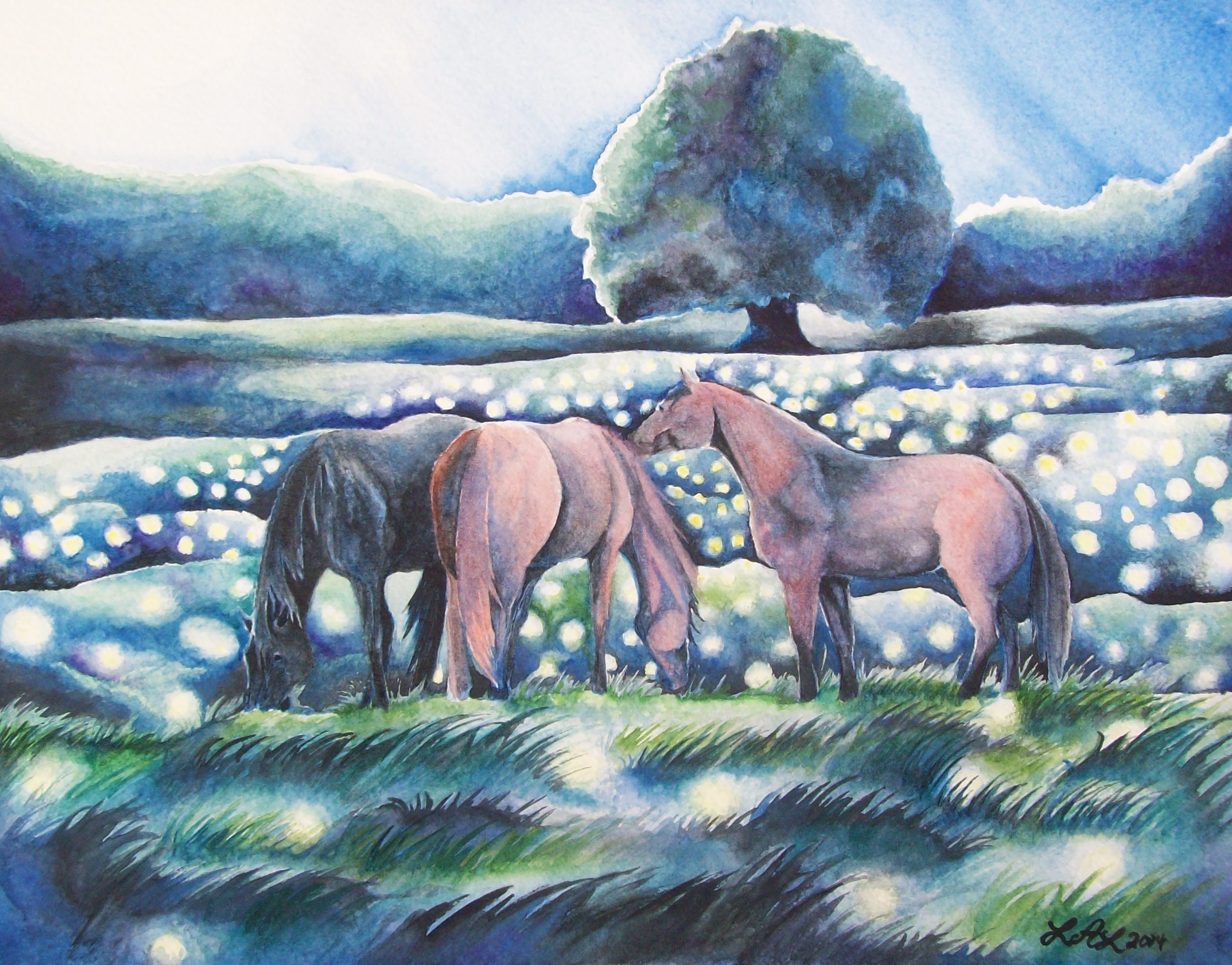 Sitting here tonight on a hot late-summer evening seems like the perfect time to look back on “Summer Night,” a painting completed around this time of year in 2014. Three horses under the full moon, quietly grazing and bonding in a tall meadow full of fireflies. Crickets are chirping, horses munching, and the soft breeze blowing through the grass cools the evening air.